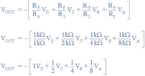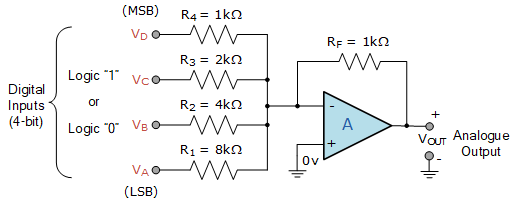 따라서 "D" 입력 저항을 1kΩ으로, "C" 입력 저항을 2kΩ(D의 두 배), "B" 입력 저항을 4kΩ(두 배 C), "A" 입력 저항을 설정하면 8kΩ(더블 B)에서 피드백 저항 RF 가 1kΩ으로 다시 설정된 경우 4비트 이진 가중 디지털-아날로그 변환기의 전달 특성은 다음과 같습니다.
