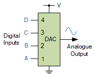 디지털 -아날로그 변환기 ( DAC)는 더 일반적으로 알려져 있으며 이전 튜토리얼에서 살펴본 아날로그-디지털 변환기 와 반대입니다 . DAC는 출력 전압(또는 전류)이 디지털 입력 수의 값에 비례하여 이진수 또는 이진수가 아닌 숫자와 코드를 아날로그로 변환합니다.