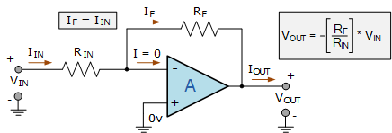 반전 증폭기의 경우 입력 전압 V IN 은 적절한 입력 저항 R IN 을 통해 반전 입력에 직접 연결되며 반전 증폭기 폐쇄 루프 전압 이득 A V(CL) 은 이 두 저항의 비율에 의해 다음과 같이 결정됩니다. 표시됩니다.
