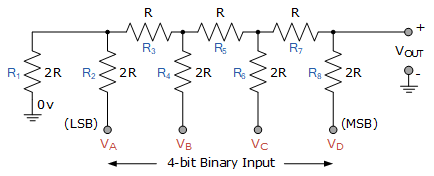 이 4비트 저항성 래더 회로는 복잡해 보일 수 있지만 저항을 병렬 및 직렬 조합으로 함께 연결하고 간단한 회로 법칙을 사용하여 입력 소스로 다시 작업하여 출력의 비례 값을 찾는 것이 전부입니다. 모든 바이너리 입력이 0V에 접지되어 있다고 가정합니다. 즉, V A = V B = VC = V D = 0V(LOW)입니다. 따라서 이 4개의 입력에 해당하는 이진 코드는 0000이 됩니다 .