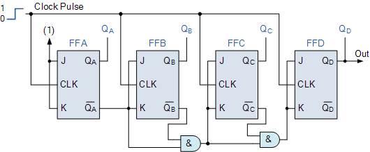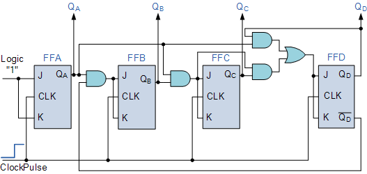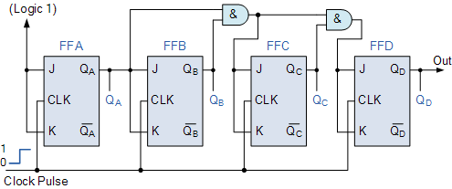 플립플롭 FFB 의 J 및 K 입력은 플립플롭 FFA 의 출력 QA 에 직접 연결되지만 플립 플롭 FFC 및 FFD 의 J 및 K 입력은 별도의 AND 게이트 에서 구동되며 이 게이트에도 신호가 공급됩니다 . 이전 단계의 입력과 출력. 이러한 추가 AND 게이트는 다음 단계의 JK 입력에 필요한 논리를 생성합니다.
