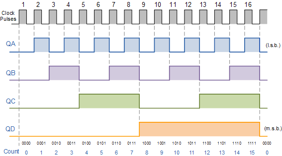 위에서 볼 수 있듯이 외부 클록 펄스(카운트할 펄스)는 카운터 체인의 각 JK 플립플롭 에 직접 공급되고 J 및 K 입력은 모두 토글 모드에서 함께 연결되어 있지만 첫 번째 플립플롭에서 플립플롭 FFA (LSB)는 HIGH로 연결되어 있으며 논리 "1"은 플립플롭이 모든 클록 펄스에서 토글되도록 허용합니다. 그런 다음 동기 카운터는 공통 클록 신호에 응답하여 미리 결정된 상태 시퀀스를 따르며 각 펄스에 대해 하나의 상태를 전진시킵니다.