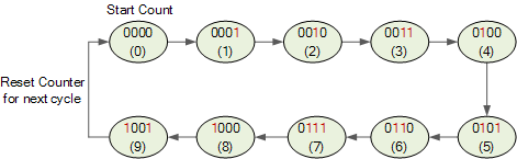 BCD 카운터는 10가지 상태의 순서를 따르며 0000 부터 1001까지 의 BCD 번호를 사용하여 계산 한 다음 0000 으로 돌아가서 반복됩니다. 이러한 카운터에는 각 십진수를 나타내기 위해 최소한 4개의 플립플롭이 있어야 합니다. 왜냐하면 십진수는 MOD-10 카운트를 제공하는 최소 4비트의 이진 코드로 표시되기 때문입니다.