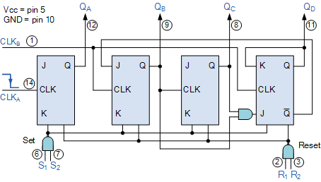 추가 입력 핀 R 1 및 R 2 는 카운터 "재설정" 핀이고 입력 S 1 및 S 2 는 "설정" 핀입니다. 논리 1에 연결되면 재설정 입력 R 1 및 R 2는 카운터를 다시 0, 0( 0000 )으로 재설정하고, 설정 입력 S 1 및 S 2 가 논리 1에 연결되면 카운터를 최대로 설정합니다. 실제 카운트 수나 위치에 관계없이 9 ( 1001 )입니다.
