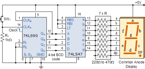 74LS47 이진 코드 십진 입력은 74LS90 BCD 카운터의 해당 출력에 연결되어 푸시 버튼 SW1 을 누를 때마다 표시된 대로 7세그먼트 디스플레이에 카운트 순서를 표시할 수 있습니다 . 푸시 버튼과 1kΩ 저항의 위치를 변경하면 푸시 버튼 스위치 SW1 의 활성화 또는 해제 시 카운트가 변경될 수 있습니다 .