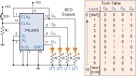 1부터 10까지 계산하는 디지털 카운터를 만들려면 카운터가 이진수 0000 부터 1001 까지만 계산해야 합니다 . 이는 10진수로 0부터 9까지이며 다행히도 카운팅 회로는 비동기식 74LS90 10진 카운터 와 같은 회로를 갖춘 집적 회로로 쉽게 사용할 수 있습니다 .