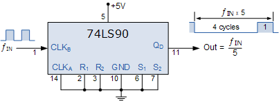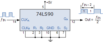 5로 나누기 카운터 섹션을 구성하는 4개의 플립플롭이 비활성화된 상태에서 클록 신호가 입력 핀 14( CLK A )에 적용되고 핀 12( Q A ) 에서 가져온 출력을 사용하면 표준 나누기를 생성할 수 있습니다. 그림과 같이 주파수 분할 회로에 사용하기 위한 x2 이진 카운터.