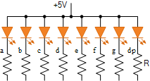 단일 저항기 – 여기서는 단일 직렬 전류 제한 저항기 R이 사용됩니다. 일정한 디스플레이 밝기에 특별히 관심이 없다면 이것이 7세그먼트 디스플레이를 제어하는 가장 쉽고 간단한 옵션입니다.