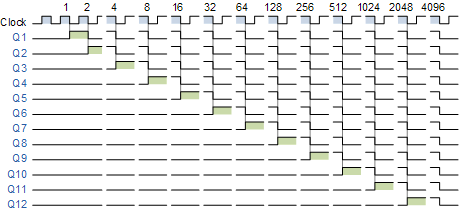 그런 다음 출력 카운트( Qn )는 카운터의 "N번째" 단계로 정의됩니다. 예를 들어, 출력 Q6은 2 6 = 64 ( 클럭 주파수의 1/64 ) 이고 Q12는 2 12 = 4096( 클럭 주파수의 1/4096) 입니다 .