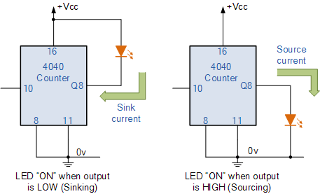위의 두 번째 회로는 LED가 출력 Q8 과 접지(0v) 사이에 연결되어 있음을 보여줍니다. 이는 전류가 "소스"(공급)되거나 4040 카운터 출력 터미널에서 흘러나오고 출력이 "HIGH"일 때 LED가 "ON"이 됨을 의미합니다.