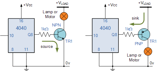 "싱크"(흡수) 및 "소스"(공급) 전류 모두에 대한 4040 카운터의 기능은 LED가 카운터의 출력 단자와 공급 장치 사이에 연결되어 부하 전류를 싱크하거나 출력 단자와 공급 장치 사이에 연결될 수 있음을 의미합니다. 부하 전류를 공급하기 위해 접지합니다. 예를 들어: