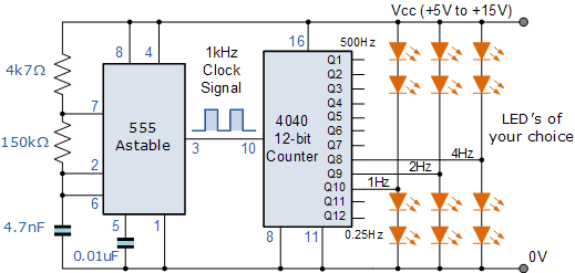타이밍 기간 T는 선택한 입력 클록 주파수에 따라 달라지며 T = 1/f 입니다 . 예를 들어 간단한 LED 플래셔 회로의 일부로 4040 12비트(¼4096) 카운터를 선택하고 12번째 비트의 가장 긴 타이밍 기간을 4초(2초 ON 및 2초 OFF)로 설정하려는 경우 또는 0.25Hz인 경우 4040 카운터의 핀 10에 대한 입력 클럭 주파수는 표시된 대로 약 1kHz(0.25 x 4096)가 되어야 합니다.