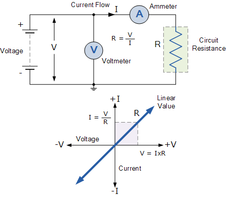 일정한 저항 ( R )의 회로에서 전압 ( v )과 전류 ( i ) 사이의 관계는 표시된 것처럼 저항 값과 동일한 기울기를 갖는 직선 iv 관계를 생성합니다.