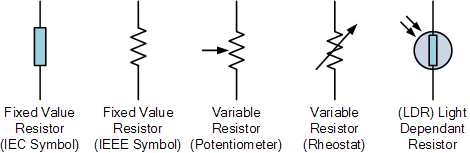 저항은 킬로 옴 ( kΩ = 10 3 Ω ) 및 메가옴 ( MΩ = 10 6 Ω ) 을 나타내는 데 사용되는 접두어가 포함된 그리스 기호( Ω , Omega)인 옴(Ohms) 단위로 측정되는 회로 요소입니다 . 저항은 양수 값에서만 음수일 수 없습니다.